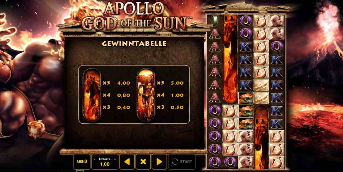 Die in Flammen lodernde Sonne sowie ein Vulkanausbruch sorgen für ein schweißtreibendes und aufregendes Abenteuer. Neben klassischen Kartenspielsymbolen wie J, Q, K und A wirst du außerdem auf einen Dämon, einen Schlangenkopf, einen gespannten Bogen, eine Harfe, ein Feuerpferd und natürlich auf den Sonnengott Apollo höchst persönlich treffen.