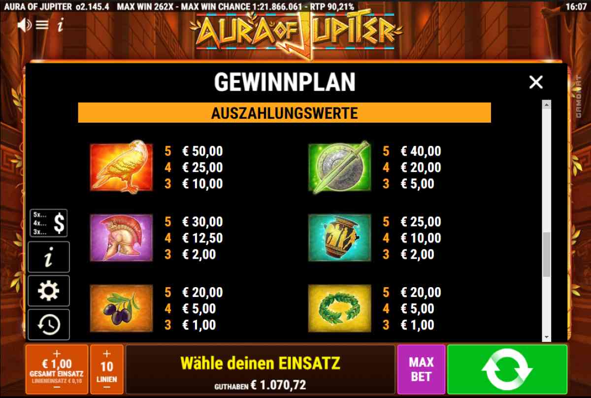 Der Slot bringt einige Highlights mit, wie zum Beispiel ein Wild-Symbol (der Gott Jupiter), das die anderen Bilder ersetzt und viele Gewinnlinien komplettiert.
