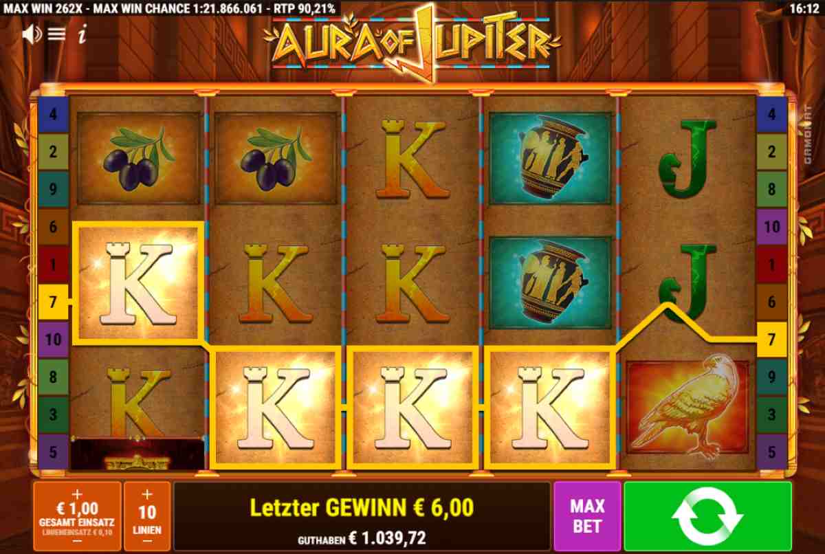 Komm an Bord, Captain und setze die Segel! Bei den JackpotPiraten bist du genau richtig, wenn du spannende Slots online spielen willst. Ein Klassiker, den du dir näher ansehen solltest, trägt den Namen Aura of Jupiter. Er stammt aus dem Hause Gamomat und hat den gleichnamigen Gott als Thema. Der Spielautomat verfügt über fünf Walzen und es dreht sich alles um die damalige Mythologie.