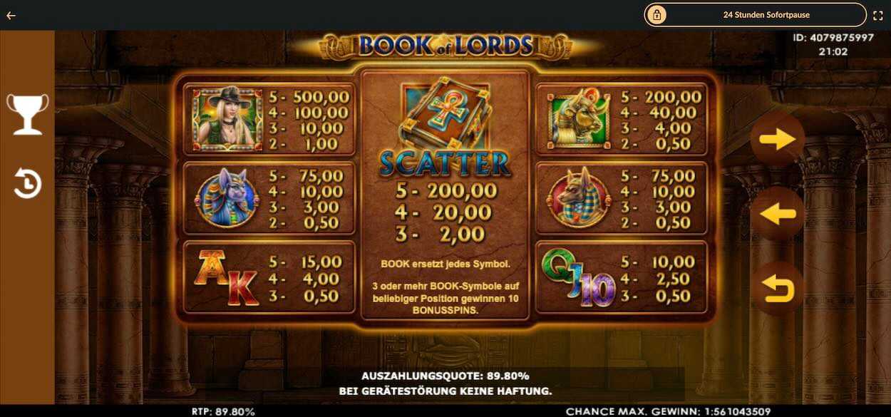 Du kannst den Book of Lords Slot umsonst und ohne Risiko ausprobieren. Spiele Book of Lords gratis in der Demo, um die Funktionen und Gewinnchancen mit Gratis-Guthaben kennenzulernen.