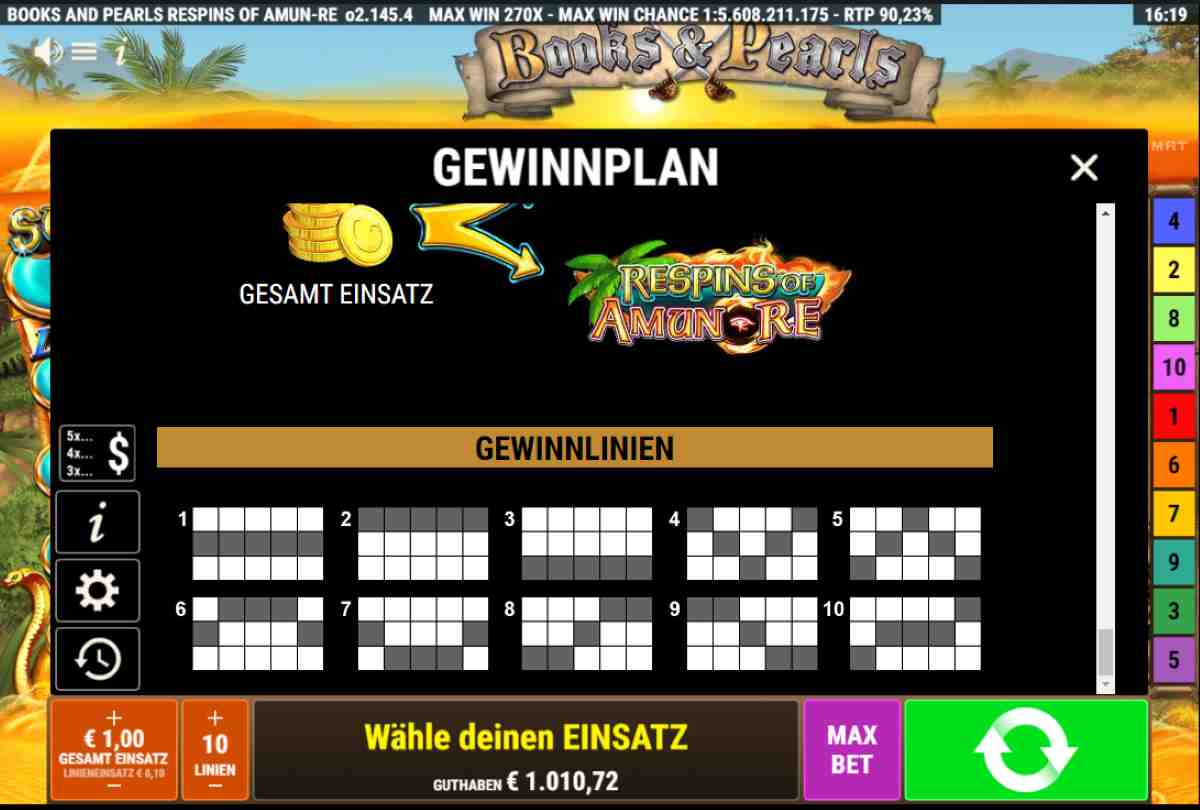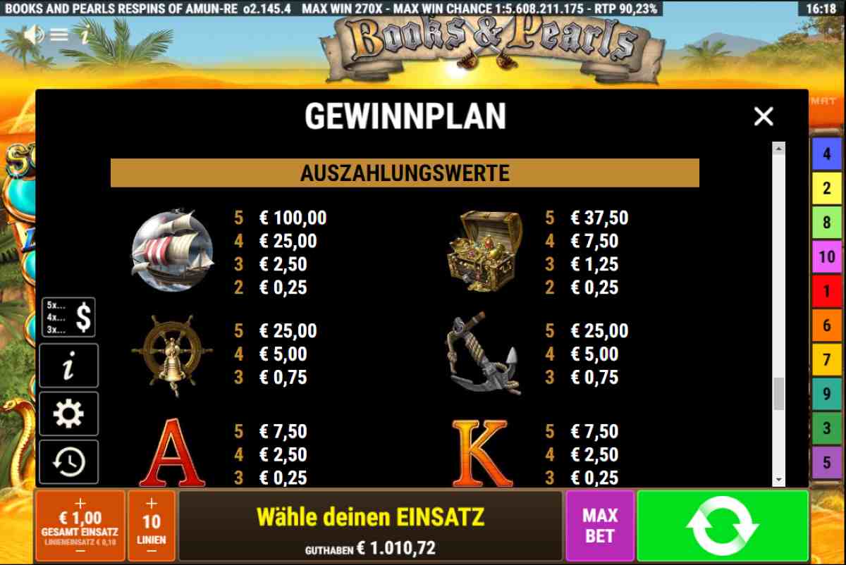 Books and Pearls Respins of Amun-Re ist ein Automatenspiel von Gamomat und läuft auf 5 Walzen und 3 Reihen ab. Der Online-Slot hat eine Auszahlungsquote von 94,14 % und du kannst mit 10 oder 5 Gewinnlinien spielen. Die Gewinnsymbole stammen allesamt aus der Welt der Piraten und sollten dir bekannt sein, Matrose! Der Pirat selbst ist das Wild-Symbol und kann andere Symbole ersetzen.