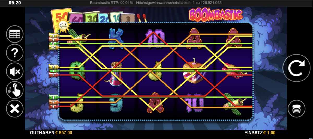 Beim Online-Spielautomat von Merkur riechst du Schwarzpulver und Lunte, denn es geht heiß und explosiv her. Bei Boombastic knallt es auf 5 Walzen mit je 3 Reihen und 10 Linien sowie einer Auszahlungsquote von 94,02 %. Mit Raketen und Krachern kannst du das 500-fache, 200-fache, 100-fache oder 50-fache deines Einsatzes gewinnen, wenn 5 identische Symbole erscheinen.