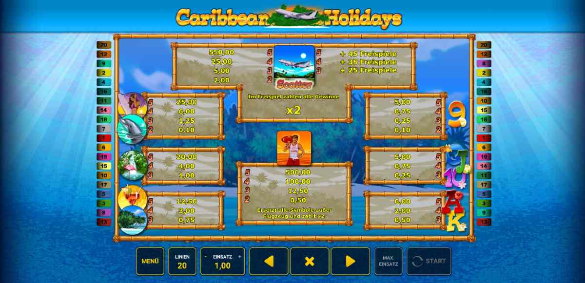Allen Seeräubern, egal ob mutiger Matrose oder unerfahrene Landratte, rate ich, den Spielautomaten Caribbean Holidays in der Online-SpielothekOnline Casino zu spielen. Im Gegensatz zu klassischen stationären SpielbankenCasinos hast du bei JackpotPiraten eine deutlich höhere Auszahlungsquote. Anstatt an Land auf gutes Wetter zu warten, hisse die Segel und reise online in die Karibik, wo du jederzeit im Sonnenschein spielen kannst!