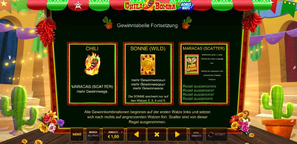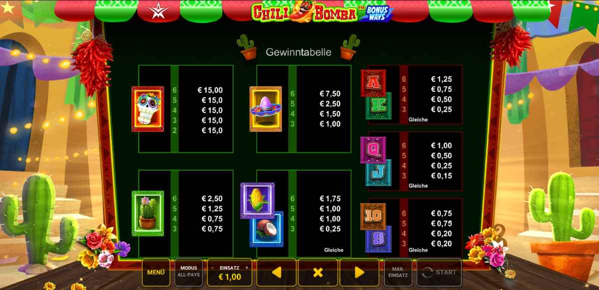 Chili Bomba ist mit 6 Walzen zu je 3 Reihen ausgestattet und du spielst mit einer Auszahlungsquote von 90,58 %. Die Symbole entstammen gemäß des Themas der mexikanischen Folklore. Das Wild-Symbol, dargestellt durch die Sonne, ersetzt andere Symbole. Die Maraca-Shaker bringen dir 10, 15, 20 oder 25 Freispiele, wenn das Scatter-Symbol 3x, 4x, 5x oder 6x auftaucht.