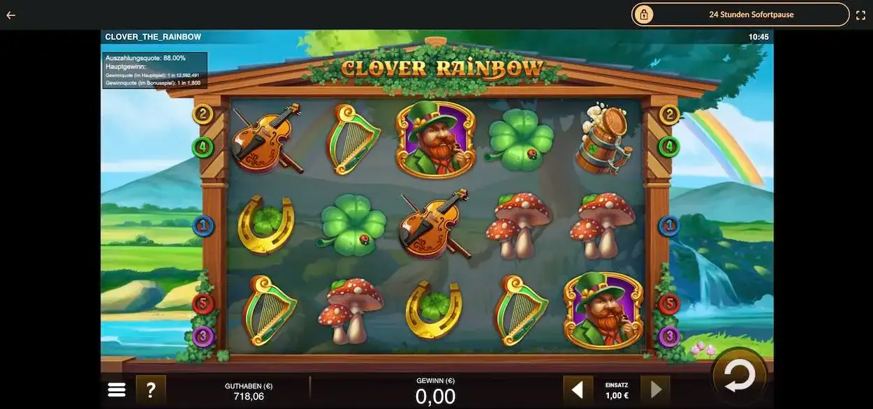 Um die Slot Demo zu aktivieren, öffnest du das Spiel regulär. Klicke auf das Feld „Spielgeld“. und spiele mit virtuellem Guthaben. So kannst du ohne Verlustgefahr die Regeln und Funktionen von Clover the Rainbow gratis erkunden.