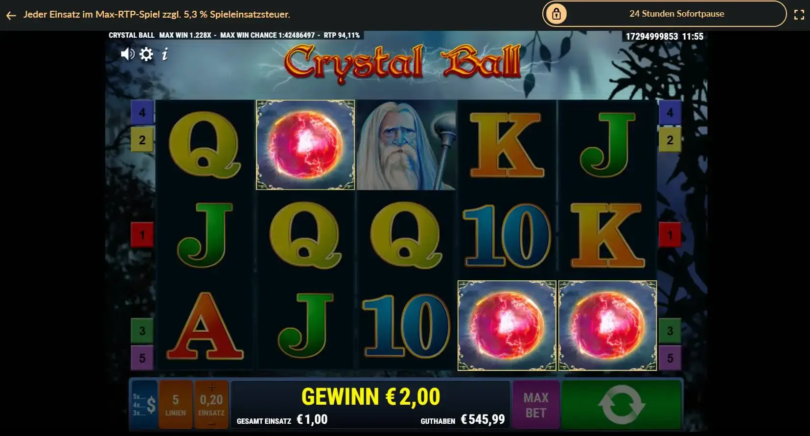 Die Auszahlungsquote von Crystal Ball liegt bei 94,11 % und beschreibt die theoretische Rückzahlungserwartung über einen langen Zeitraum. Bei einem Einsatz von 100 € zahlt der Spielautomat im Durchschnitt 94,11 € wieder als Gewinne an die Spieler aus.