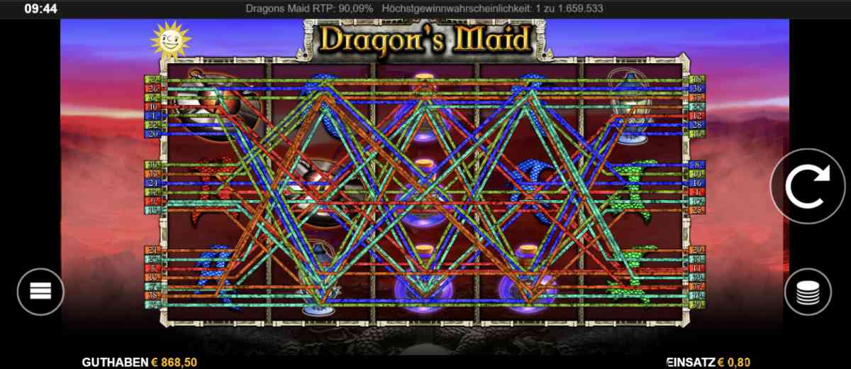 Bei Dragonâs Maid geht es mĂ€rchenhaft und magisch zu. Der Online-Spielautomat hat ein Spielfeld mit 5 Walzen und 3 Reihen sowie eine Auszahlungsquote von 94,16 %. Du kannst die Anzahl der Gewinnlinien auf 10, 20 oder 40 festlegen. Das magische Flammenauge ist 100x deinen Einsatz wert, wenn es 5x auftaucht. FĂŒr RĂŒstung und Axt gibt es 40x, fĂŒr das Zauberbuch 25x und fĂŒr Zaubertrank oder Laterne 15x den Einsatz.