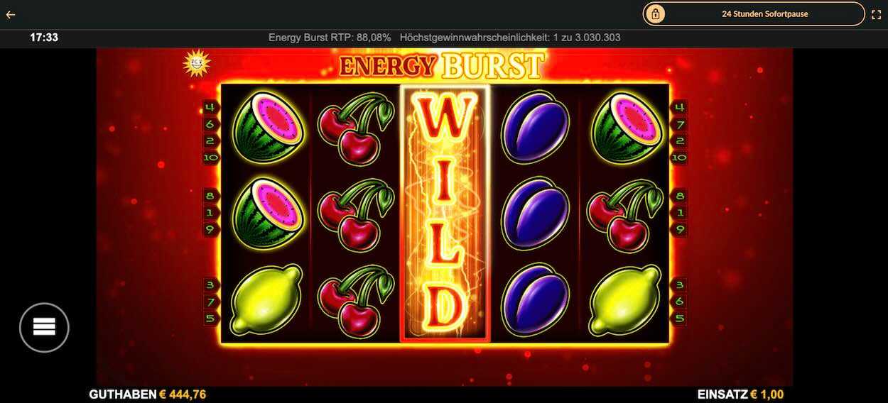 Energy Burst erscheint im 5x3-Format mit zehn Gewinnlinien. Der Spielautomat von Merkur ist von mittlerer bis hoher Volatilität und bietet dir einen RTP von 94,02 %. Deine Gewinnchancen stehen also besser als beim Spiel in der Spielhalle oder in der SpielbankCasino. Der Mindesteinsatz beträgt 0,10 €.