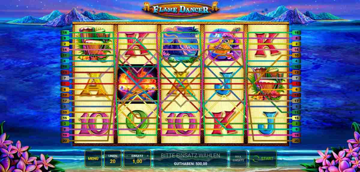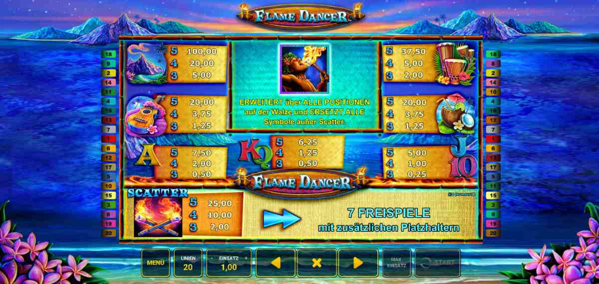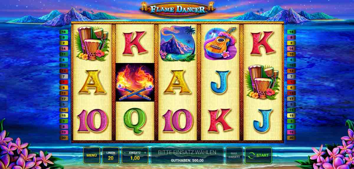 Pirat, lass uns ablegen und in wärmere Gefilde reisen. Der Flame Dancer Slot im 5x3-Format mit 20 Gewinnlinien verheißt uns eine entspannte Zeit am Strand. Die Symbole auf den Walzen zeigen Ukulelen, Kokosnüsse, Blumenketten und Hula-Tänzerinnen. Halte dich noch einmal an der Reling fest, bevor du an Land gehst.