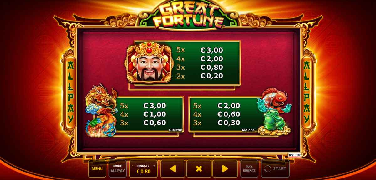 Das Great Fortune Game besteht aus fünf Walzen, vier Reihen und 1024 Wegen zum Glück. Das Spiel funktioniert nach dem All-Pay-Prinzip, das bedeutet, es gibt keine festgelegten Gewinnlinien. Daher gewinnst du, sobald du von der ersten Walze beginnend drei gleiche Symbole auf nebeneinander liegenden Walzen erspielst. Ziel ist es, dass auf allen Walzen die identischen Symbole erscheinen. Der Great Fortune Slot aus dem Hause Novoline hat allerhand asiatische Symbole zu bieten. So gibt es ein Ying-Yang Symbol, einen Kaiser, Drachen, Phönix, Koi-Karpfen, Frosch und eine goldene Schale. Hinzu kommen die klassischen Kartensymbole 9, 10, J, Q, K und A. Zu beachten ist, dass das Kaiser-Symbol auf den Walzen immer gestapelt erscheint und dir die größten Gewinne einbringt.