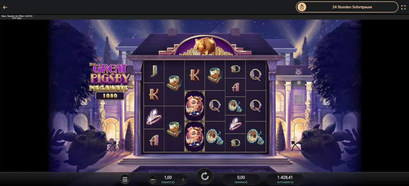 Um den Great Pigsby Megaways Slot kennenzulernen, kannst du die Demo des Spiels nutzen. Mit dieser spielst du ohne den Einsatz von Echtgeld kostenlos. Du gehst kein Verlustrisiko ein, kannst jedoch auch kein echtes Geld gewinnen.