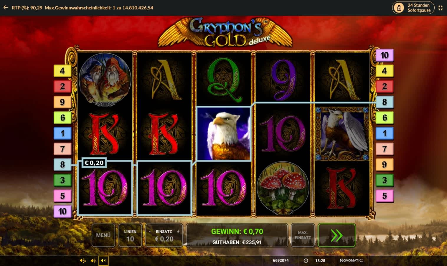 In der Online-Spielothek kannst du Gryphon’s Gold Deluxe kostenlos spielen. Du kannst nämlich alle Online-Spielautomaten in der Demo-Version ohne Risiko und mit Gratis-Guhaben kennenlernen, bevor du echtes Geld einsetzt.