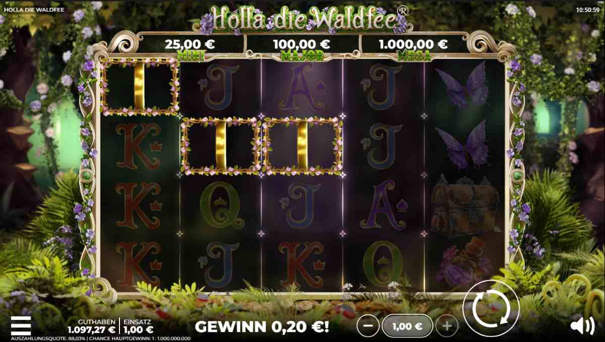 Der Spieleentwickler Hölle Games ist für seine eigenwilligen Kreationen bekannt. Der Online-Slot Holla die Waldfee kann auch den bärbeißigsten Piraten verzaubern. Auf den fünf Walzen und drei Reihen mit 25 Gewinnlinien erscheinen liebevoll gestaltete und reich verzierte Symbole. Du triffst auf Pilze, Schmetterlinge, Pergamentrollen, geschmückte Fläschchen sowie auf die Kartensymbole J, Q, K und A.