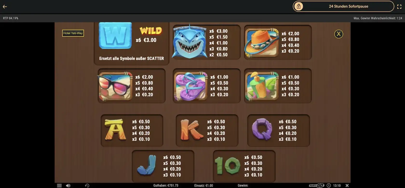Hotel Yeti Way bietet einen Max Win in Höhe des 30.000-fachen Spieleinsatzes. Den Wert der einzelnen Symbole und ihrer Gewinne kannst du in der Auszahlungstabelle prüfen.