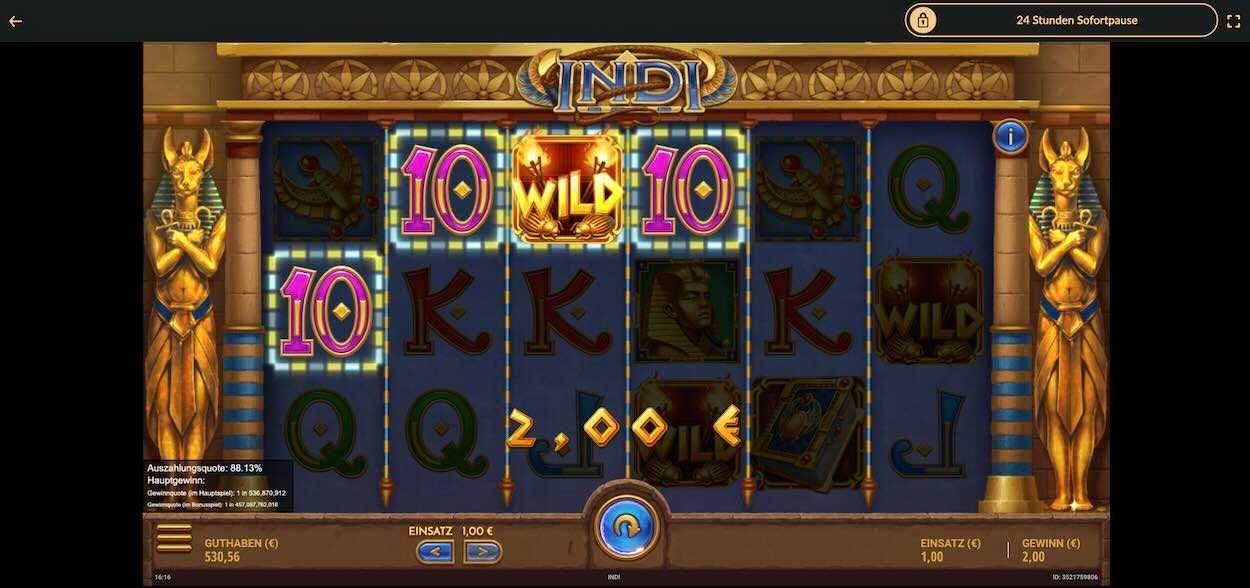 Auf den Walzen siehst du goldene Pharaonen-Masken, goldene Falken, das Auge des Ra sowie die Spielkartensymbole 10, J, Q, K und A. Protagonistin ist die Heldin Indi. Erscheint sie sechsmal auf einer Gewinnlinie, gewinnst du das 600-fache des Einsatzes.