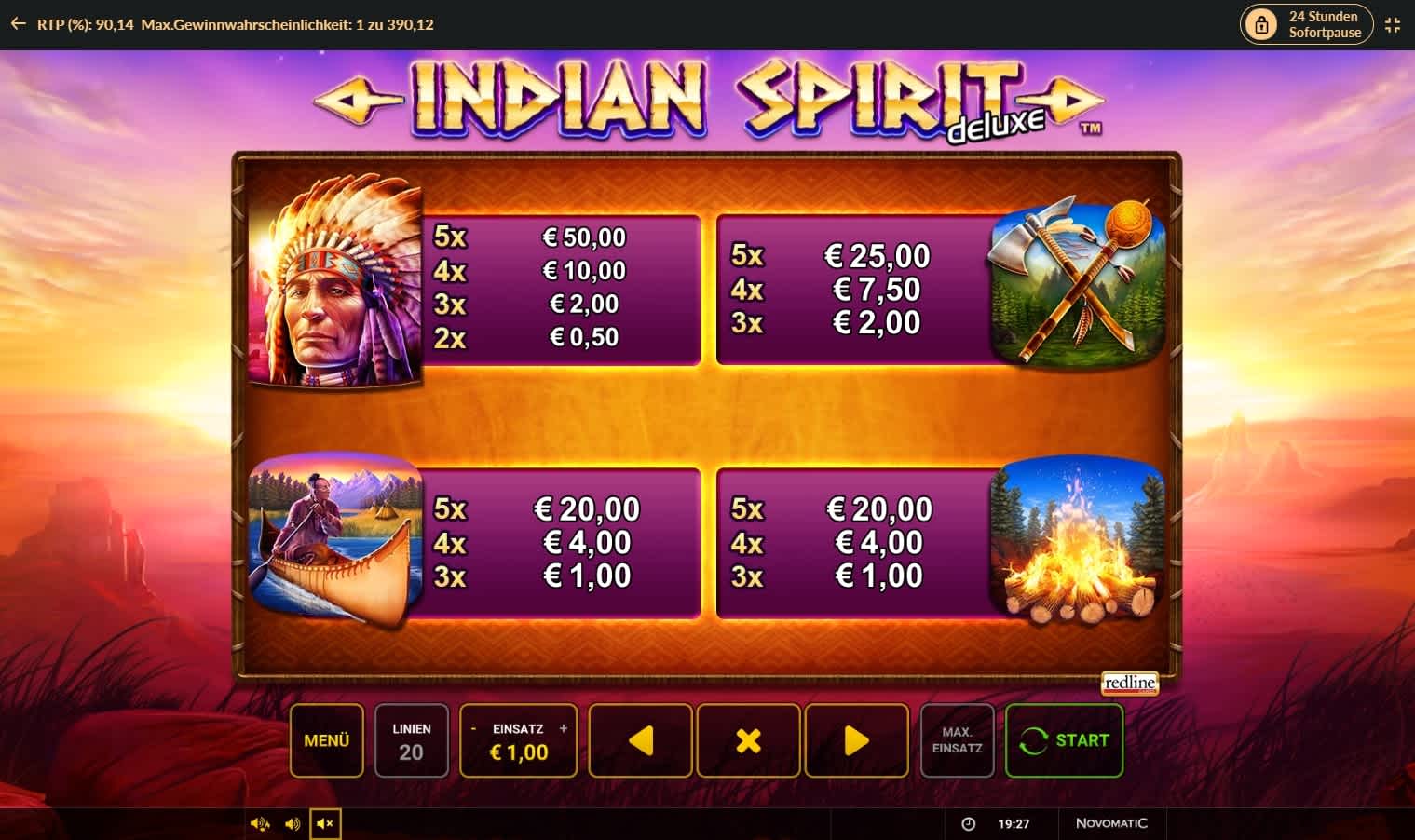Der Novomatic Spielautomat Indian Spirit aus dem Jahr 2020 dreht sich um die Indianer und die Kraft der Natur. Der große Geist Manitu kann sich in allen Dingen zeigen—vielleicht auch als dein Jackpot? Die Deluxe-Ausgabe dieses beliebten Automatenspiels des Herstellers ist detailliert gestaltet.