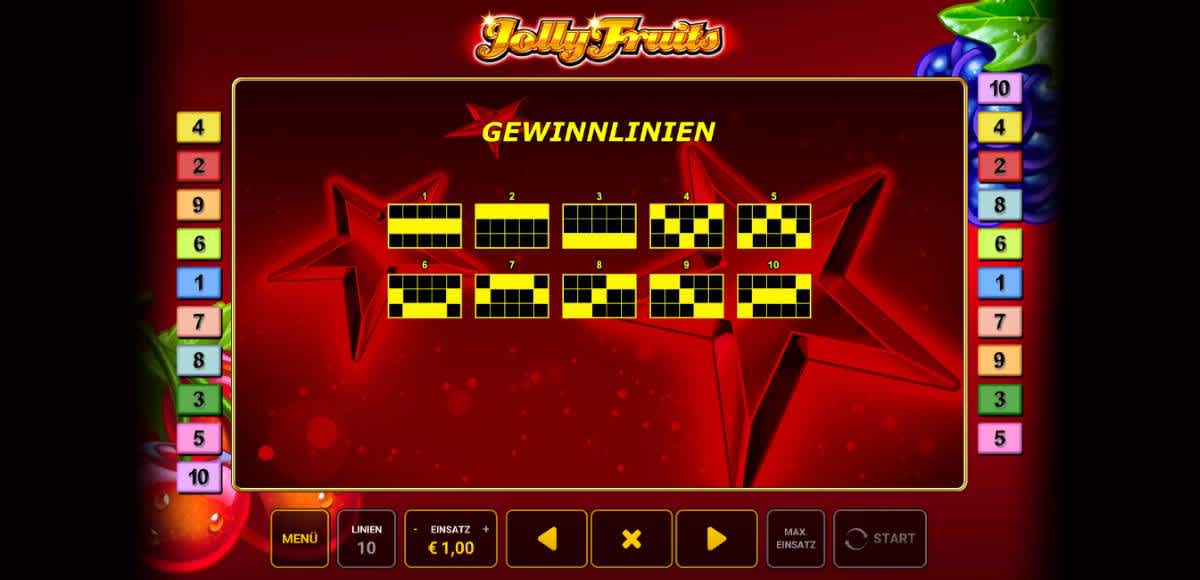 Der Novoline Jolly Fruits Slot besteht aus fünf Walzen, drei Reihen und 10 Gewinnlinien. Ziel des Spiels ist es, möglichst viele gleiche Symbole entlang einer Gewinnlinie zu erspielen. Dabei muss die Gewinnkombination auf der ersten Walze beginnen und ohne Unterbrechung fortgeführt werden. Ab drei identischen Symbolen erzielst du einen Gewinn.