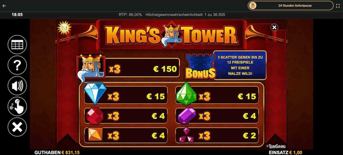 Am besten solltest du die King's Tower Demo spielen, um den Slot kennenzulernen. Du spielst mit Spielgeld und ohne Risiko. Dein eigenes Guthaben bleibt unberührt und du kannst so lange spielen, bis sich alle Features einmal präsentiert haben.