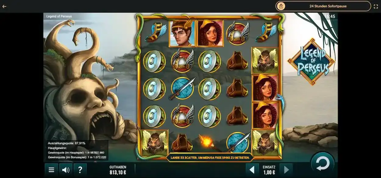 Die Auszahlungsquote (RTP) liegt bei 87,91 %. Als Gewinnsymbole begegnen dir mystische Kreaturen, nützliche Waffen und die mutigen Krieger, die es mit der Medusa aufnehmen.