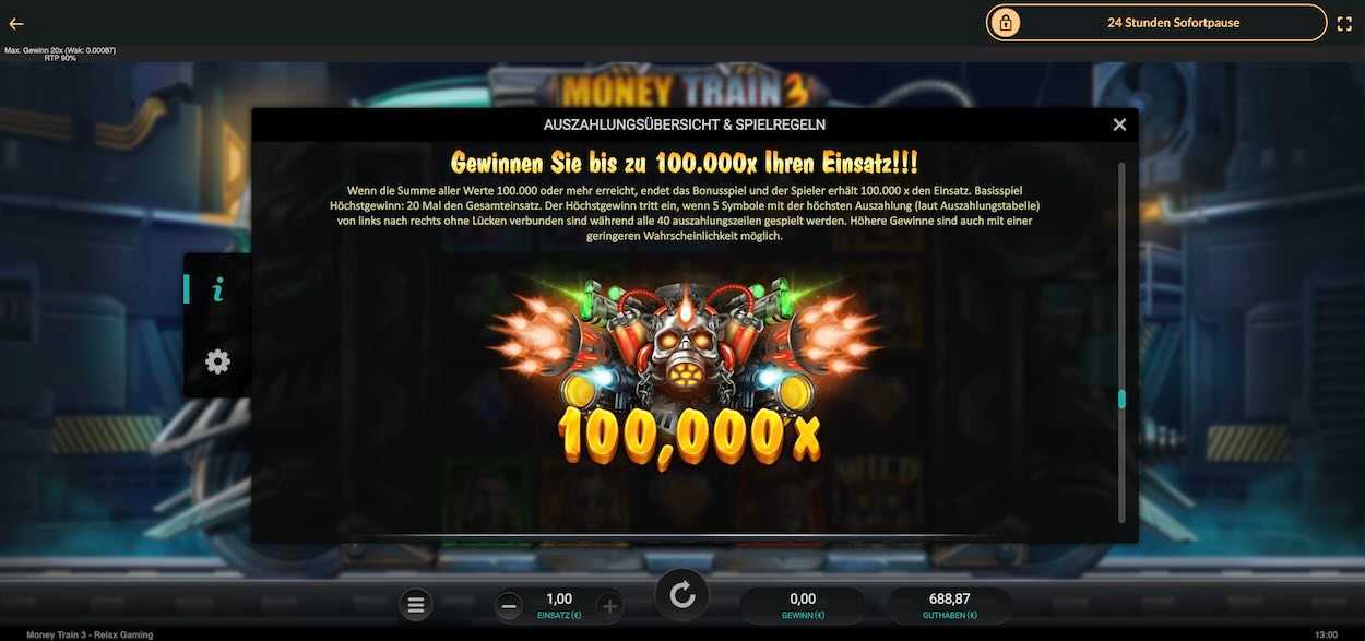 Mit etwas Glück kannst du bei Money Train 3 mit einem RTP von 86,00 % bis zum 100.000-Fachen deines Einsatzes gewinnen.