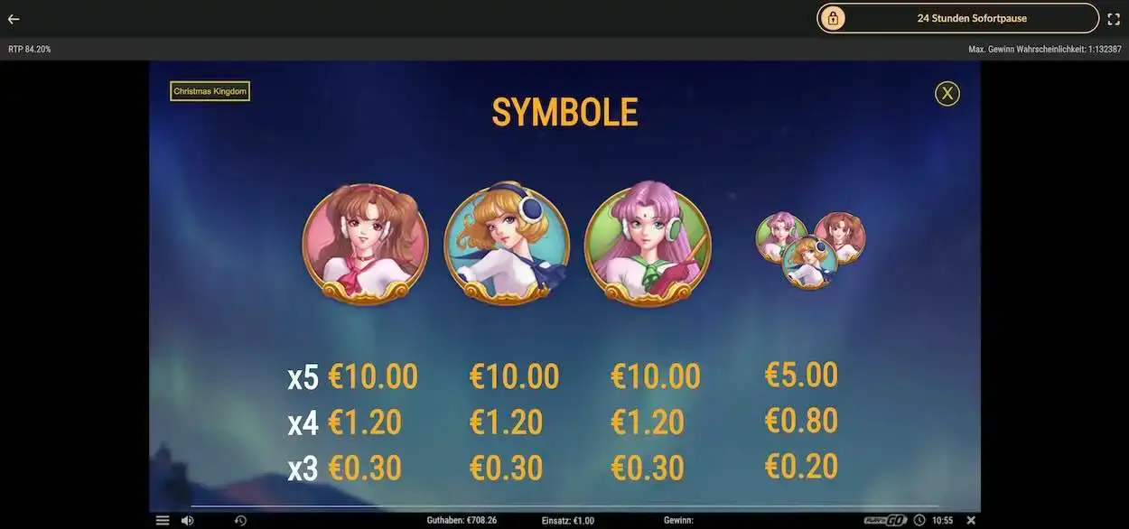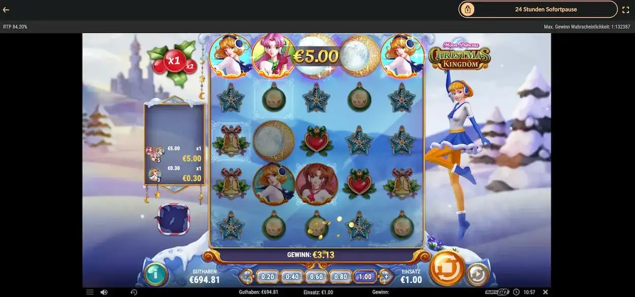 Du kannst Moon Princess: Christmas Kingdom ohne Einzahlung von Echtgeld kostenlos spielen, um den Slot mit seinen Regeln und Features kennenzulernen.