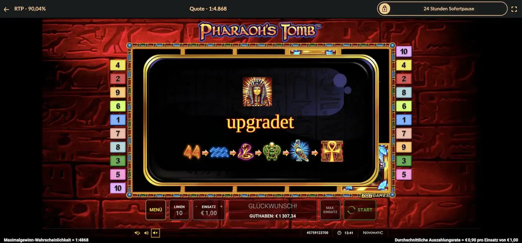 Schon seit vielen Jahren kannst du in Deutschland in der SpielbankCasino Pharaoh's Tomb spielen. Der Titel von Novomatic ist seit über einem Jahrzehnt hierzulande beliebt. Bequem rund um die Uhr ist das Spiel für dich in einer legalen Online-SpielothekOnline Casino verfügbar.