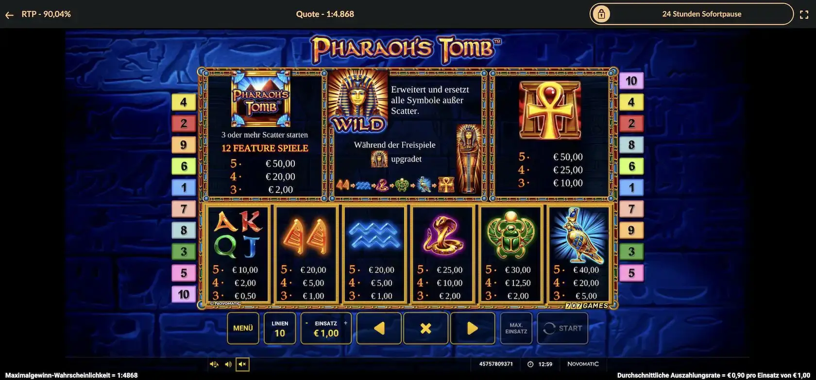 - Öffnen des Spiels und Start der Spielrunde: Such Pharaoh’s Tomb im Spielangebot und starte den Slot. Du kannst den Spieleinsatz unter den Walzen anpassen und ab 0,01 € pro Runde starten. Für den Start der Spielrunde klickst du den Start-Button.