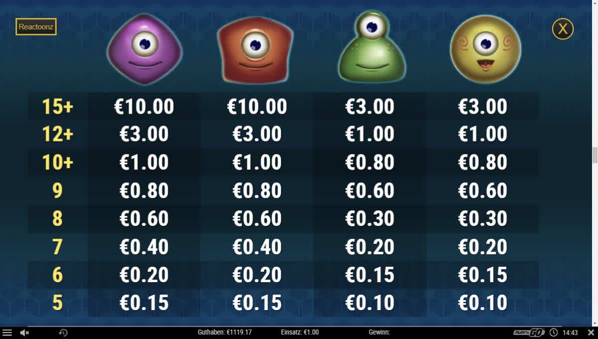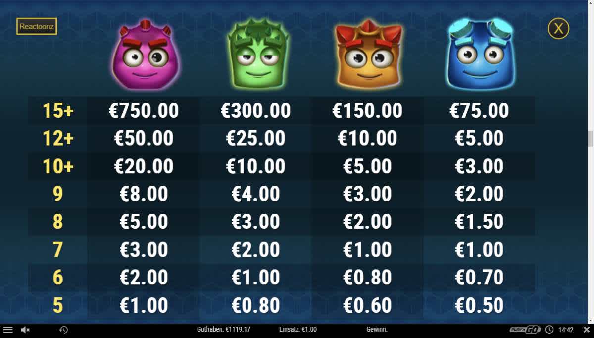 Lust auf ein besonderes Abenteuer mit ein paar witzigen bunten Außerirdischen? Das Automatenspiel Reactoonz aus dem Hause Plan’ GO bietet ein etwas anderes Slot-Erlebnis, das du bequem online spielen kannst. Drehe die sieben Walzen mit den sieben Reihen und schau, wie die kleinen bunten Alien-Symbole reagieren!