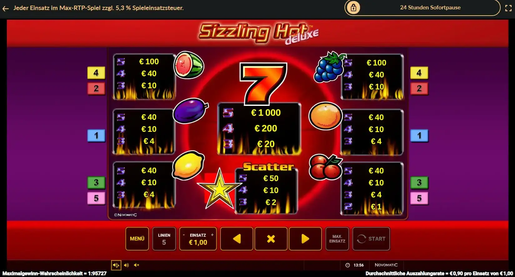 Die Auszahlungsquote (RTP) von Sizzling Hot liegt bei 94,16 %. Dieser Wert gibt an, dass 94,16 % der Spieleinsätze wieder in Form von Gewinnen an die Spieler ausgezahlt werden.
