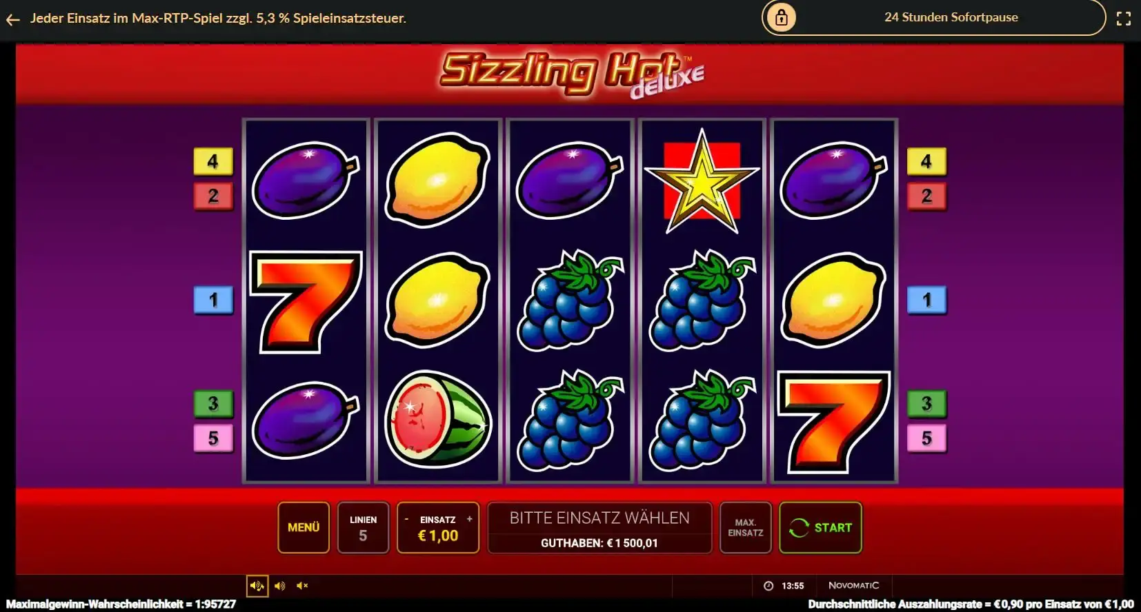 Sizzling Hot Deluxe ist ein Online Spielautomat mit fünf Walzen und fünf Gewinnlinien, den Novoline 2007 veröffentlicht hat. Auf den Walzen siehst du traditionelle Slot Symbole, wie etwa Früchte, die 7 oder Sterne.