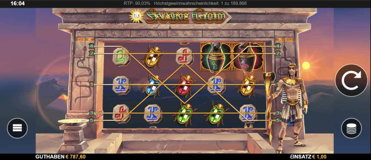 Bei Snake God handelt es sich um einen Fünf-Walzen-Slot mit fünf fixen Gewinnlinien. Ebenso gibt es ein Wild-Symbol (der Pharao), der andere Symbole (den Scatter ausgenommen) ersetzt und Gewinnkombinationen ergänzt. Letzterer wird hingegen von der Schlange verkörpert.