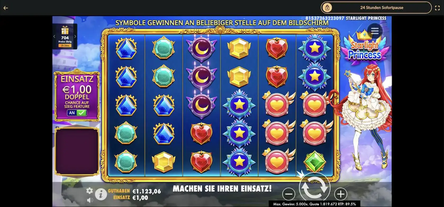 Der Mindesteinsatz des Slots liegt bei 0,20 €, maximal kannst du bis zu einen Euro pro Spielrunde einsetzen. Beeindruckend: Der Höchstgewinn von Starlight Princess liegt beim 5.000-fachen des Einsatzes.