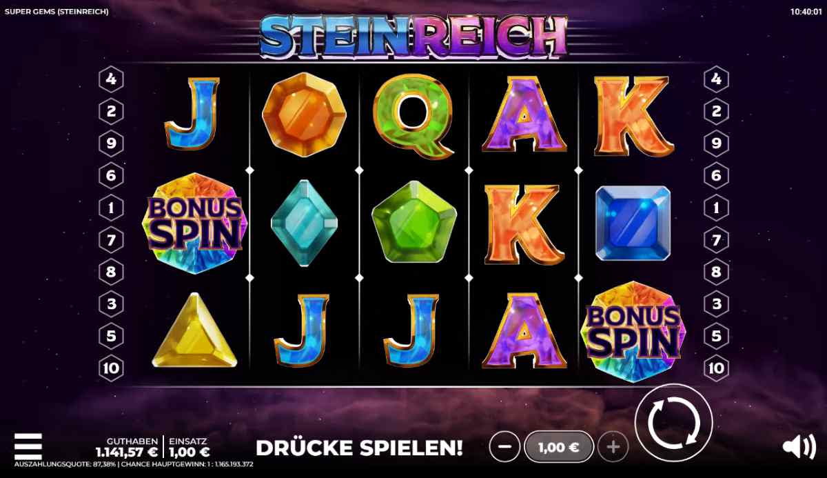 Die Symbole und Gewinne bei Super Gems (Steinreich) sind abgehoben, das Design aber denkbar bodenständig. Hölle Games setzt auf einen traditionellen Slot-Aufbau aus fünf Walzen mit jeweils drei Reihen und zehn aktiven Gewinnlinien. Vor einer Spielrunde kannst du den Einsatz anpassen. Mindestens 0,10 € müssen es sein, maximal sind bis zu 1 € pro Drehung möglich.