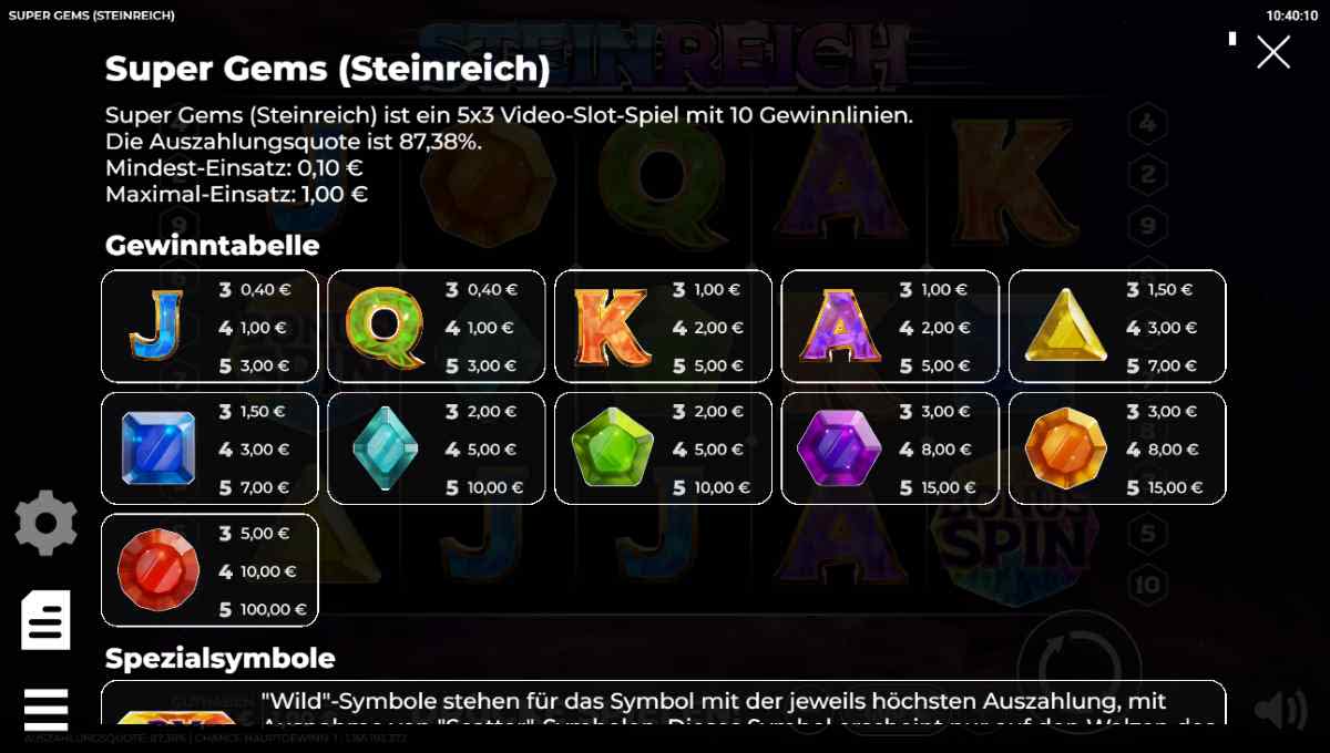 Super Gems wird mit einer Auszahlungsquote von 87,38 % gespielt. Dieser Wert wird auch als RTP bezeichnet und gibt an, wie viel Prozent der Einsätze langfristig als Gewinn an die Spieler ausgeschüttet werden.