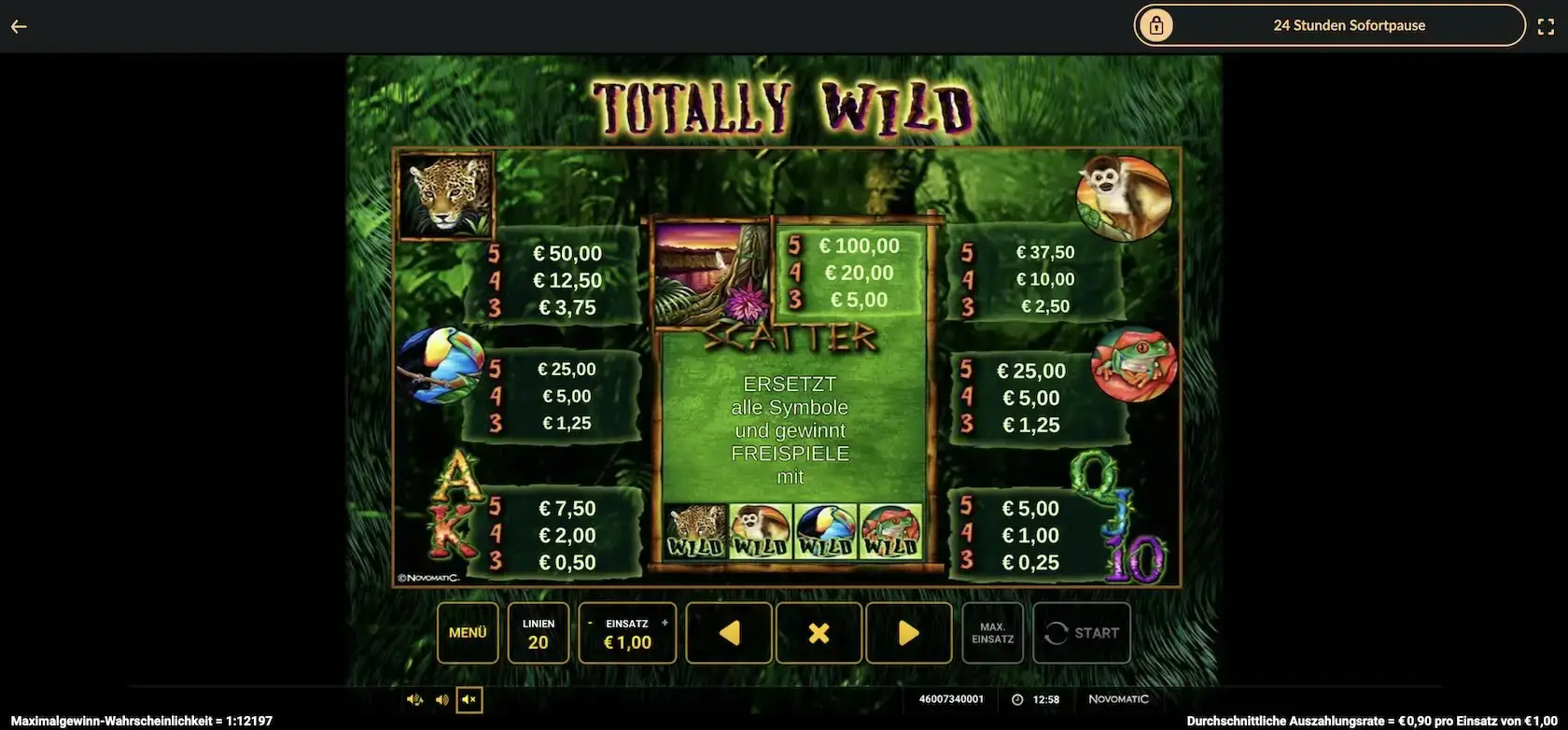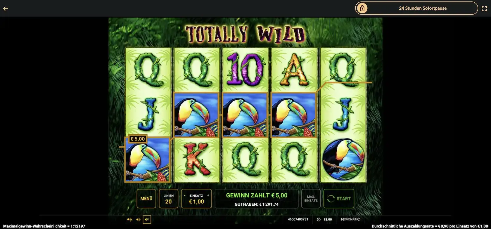 Für den risikolosen Test des Slots bietet dir Novomatic eine Demo von Totally Wild an. In dieser steht dir ein virtuelles Spielguthaben zur Verfügung, das du nach Lust und Laune einsetzen kannst. Geht dir das Kapital aus, startest du die Demo neu und hast frisches Guthaben auf dem Konto.