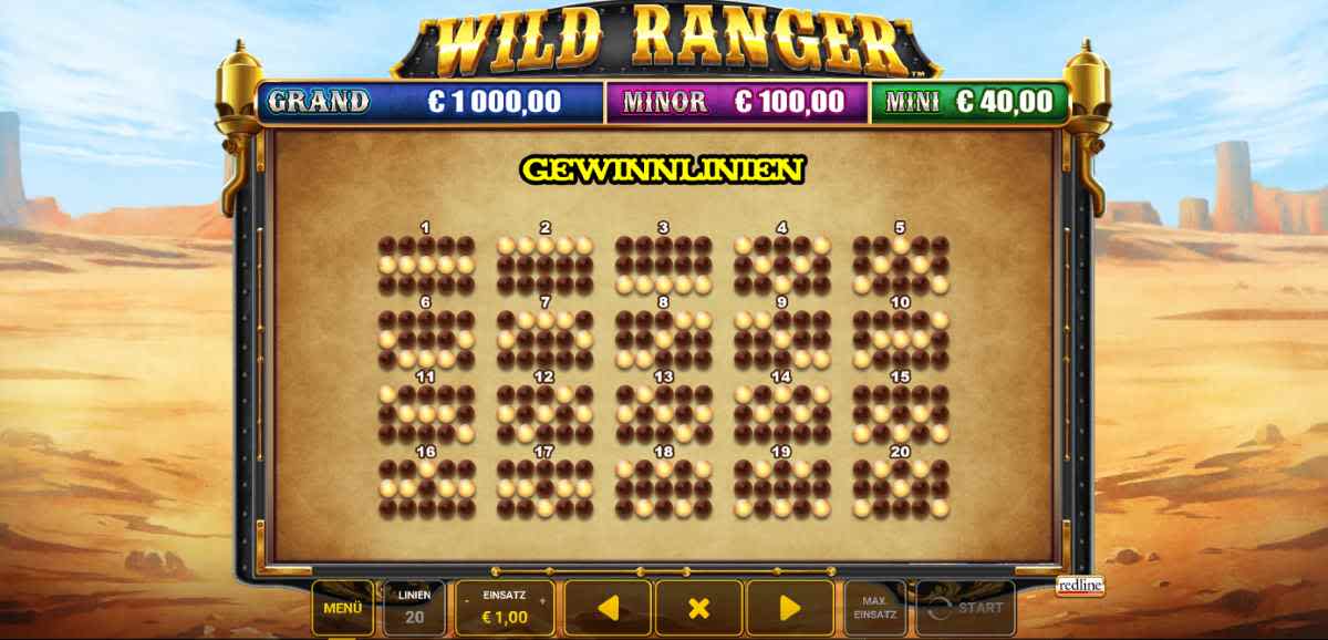 Der Entwickler Novomatic hat dem Wild Ranger Spielautomaten ein Wild-West-Thema verpasst. Auf einem klassischen Spielfeld mit fünf Walzen und drei Reihen sind 20 Gewinnlinien verteilt. Die Auszahlungsquote liegt bei 90,15 %. Du schlüpfst in die Rolle des Rangers und jagst Gesetzlose. Dabei sind Pferd, Geldsack, Pistole und Whiskey wichtige Gewinnsymbole.