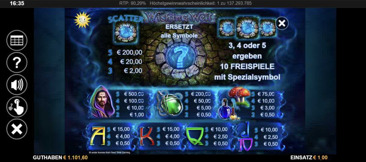 Der Wunschbrunnen aus dem Titel funktioniert als Wild- und Scatter-Symbol. Lukrative Gewinnsymbole sind der Mystiker, das Amulett sowie Fliegenpilz und Zaubertrank, die deinen Einsatz jeweils 500x, 200x oder 75x auszahlen. Ab 3 Scatter-Symbolen beginnt die Bonus-Runde. Für die 10 Freispiele gibt es ein Spezialsymbol, welches sich auf die gesamte Walze ausbreitet.